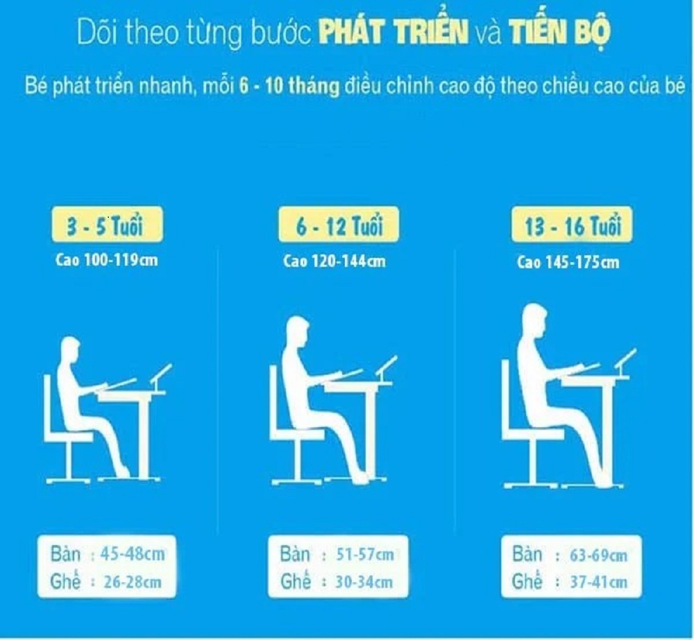 Lưu ý chiều cao bàn học cũng phải phù hợp và cần tỉ lệ thuận chiều cao của ghế. Thông thường các đơn vị sản xuất luôn nghiên cứu kỹ càng về kích thước của bàn, ghế. Nên quý khách có thể an tâm vì kích thước đều có sự phù hợp với nhau.