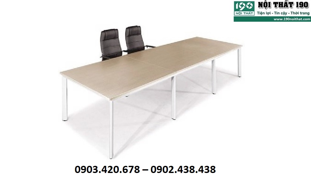 Đây là bàn họp lớn với kích thước W2400 x D1200 x H750mm. Chất liệu của bàn có mặt từ gỗ công nghiệp cao cấp và được phủ melamine. Chính lớp phủ này sẽ giúp chống tình trạng trầy xước, giúp bàn luôn đẹp và bền bỉ. Kích thước của bàn dài khoảng 2.4m và phù hợp cho từ 8 đến 10 người ngồi.