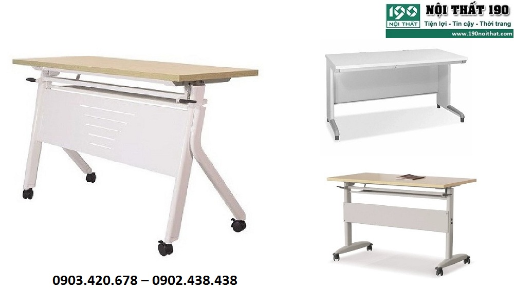 Các mẫu bàn training 190 chân bánh xe được nhiều doanh nghiệp lựa chọn nhờ tính linh hoạt, cơ động khi cần di chuyển, giải phóng không gian. Bàn có khung chân sắt hoặc thép sơn tĩnh điện, chân bánh xe nhựa cao cấp có thể di chuyển khi cần và khóa bánh khi cần cố định ở một vị trí. Bàn training chân bánh xe có thể gấp gọn nhờ khớp nối thông minh dưới ngăn bàn. Loại bàn văn phòng này cũng được trang bị các tính năng cơ bản như yếm lửng, hộc bàn.